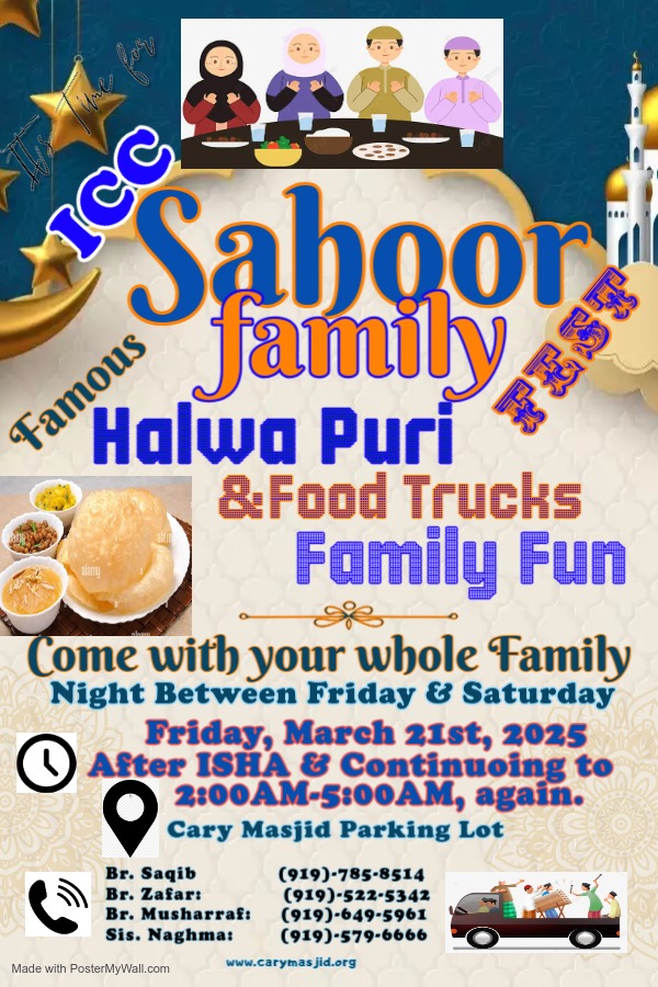 Come with your whole family and join ICC for Sahoor Family Fest on Friday, March 21st, 2025 after Isha and then again from 2:00AM to 5:00AM (Friday night to Saturday morning) in the Cary Masjid Parking Lot! Sahoor Family Fest includes delicious halwa puri, food trucks, and family fun! You don’t want to miss it!