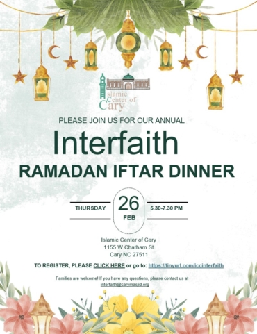 PLEASE JOIN US FOR OUR ANNUAL Interfaith RAMADAN IFTAR DINNER on Thursday February, 26th 5:30 PM to 7:30 PM Islamic Center of Cary 1155 W Chatham St Cary NC 27511 TO REGISTER, PLEASE CLICK HERE Families are welcome! If you have any questions, please contact us at interfaith@carymasjid.org