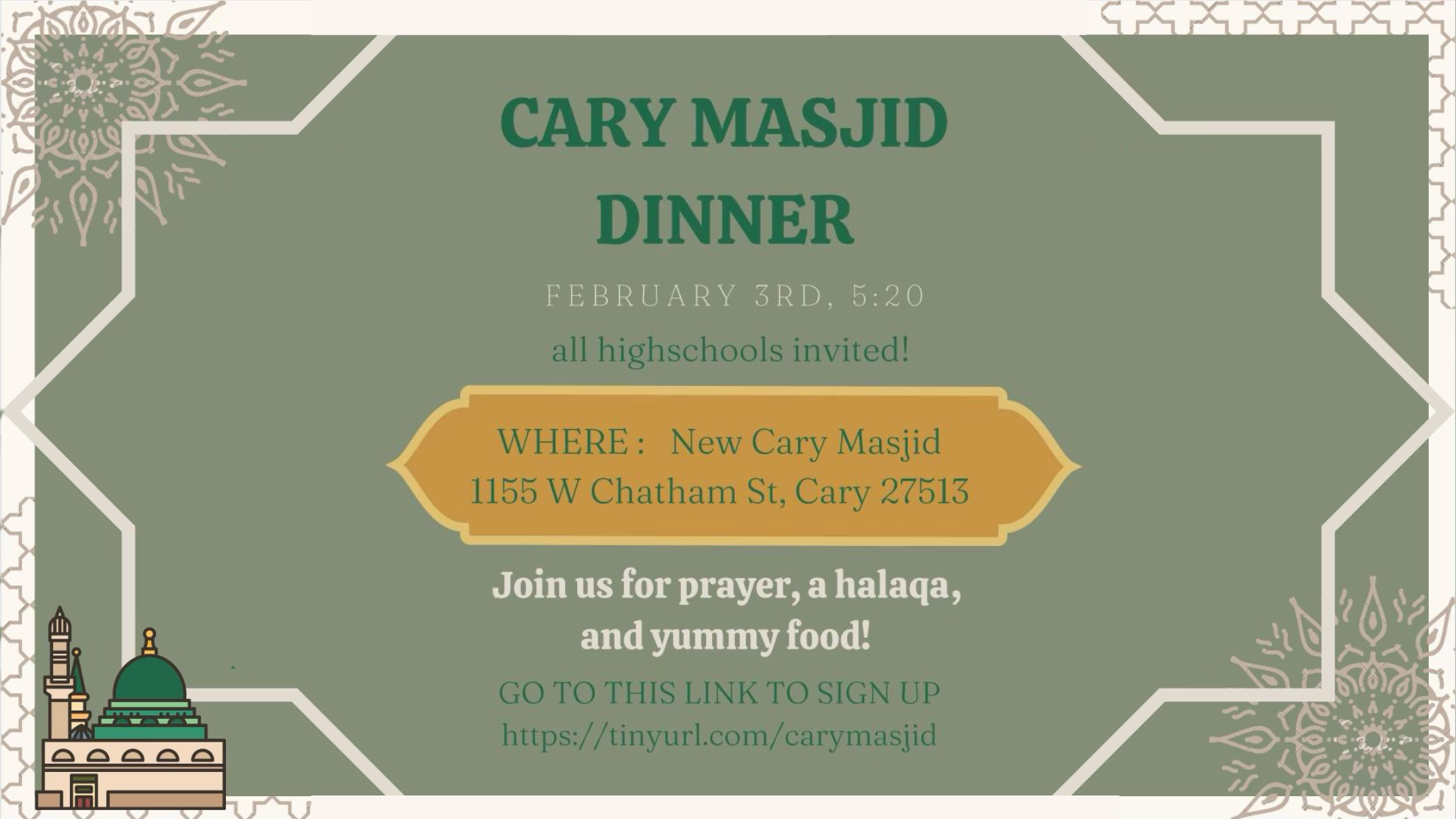 Cary Masjid and local high school MSAs will be hosting a dinner for all high schoolers in the area! Join us before Maghrib on February 3rd for dinner, a halaqa, and more at the NEW Cary Masjid! Please RSVP using this link!