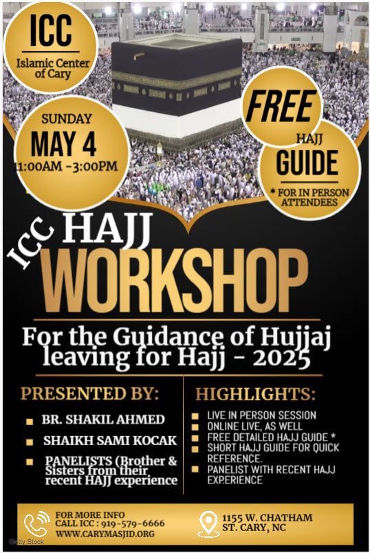 Join us on May 2nd from 11am for a workshop providing guidance for leaving for Hajj! Presented by Br. Shakil Ahmed, Sh. Sami Kocak, and a wonderful panel of brothers and sisters with recent Hajj experience. You will also receive a free detailed Hajj guide and a short Hajj guide for quick reference if you attend in person! If you can’t make it in person, we will also livestream the program inshAllah!