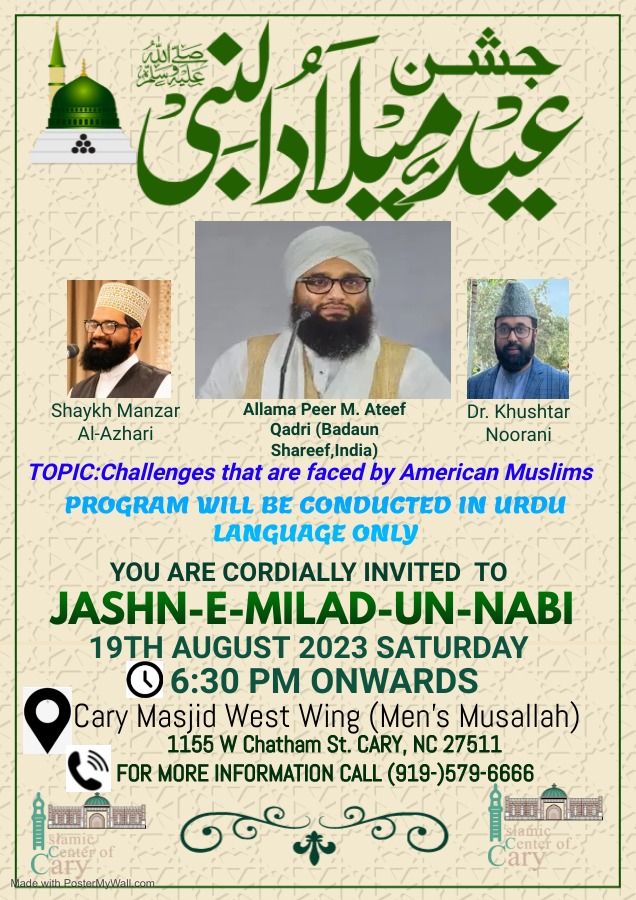 « All Events This event has passed. Jashn e Milad un Nabi August 19, 2023 @ 6:30 pm - 10:00 pm « Weekend of Inspiration with Sheikh Umair Haseeb ICC Youth Sister’s Pottery Painting » Add to calendar Google Calendar iCalendar Outlook 365 Outlook Live Details Date: August 19, 2023 Time: 6:30 pm - 10:00 pm Event Category: Cary Masjid