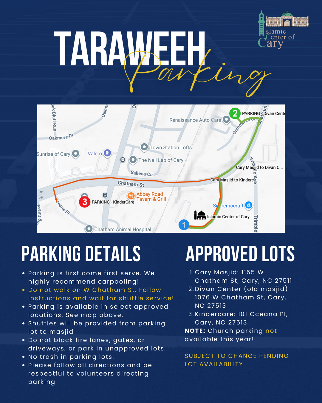 - Arrive early to park in the masjid lot and expect offsite parking in approved locations in case of overflow. Shuttles will be provided from parking lots.