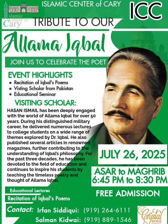 Join us for a wonderful program as a tribute to our beloved poet Allama Iqbal. Visiting scholar Hasan Ismail will be reciting Iqbal’s poems and will provide a lecture on Iqbal, Shairi, and Millat-e-Islamia from Asr to Maghrib in the Cary Masjid Banquet Hall on Saturday, July 26th.