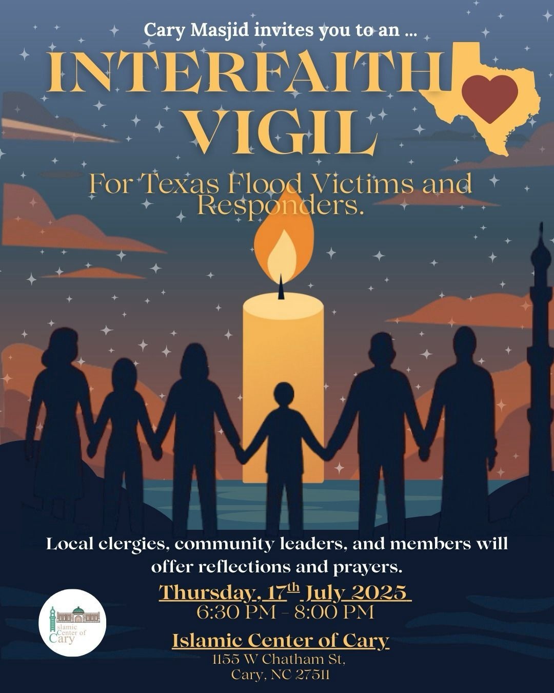 Interfaith Evening of Remembrance & Prayer Thursday, July 17, 2025 | 6:30 PM Islamic Center of Cary | 1155 W Chatham St, Cary, NC 27511 The Islamic Center of Cary invites the entire community to an Interfaith Evening of Remembrance, Prayer, and Unity in response to the recent flood tragedies…