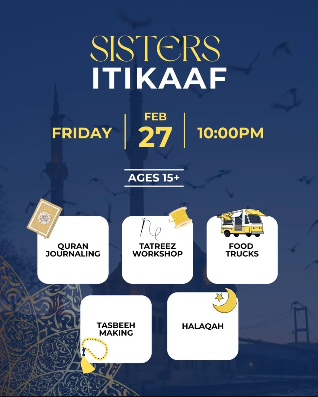 ✨ Ramadan Sisters I'tikaaf ✨ Join us for a Night of Worship, Reflection, and Sisterhood! 📅 Date: February 27 ⏰ Time: 10 PM (after Taraweeh) 📍 Location: Islamic Center of Cary Activities include: Quran Journaling Tatreez Workshop Tasbeeh Making Food Trucks Halaqah & more! Don't miss this chance to strengthen… |