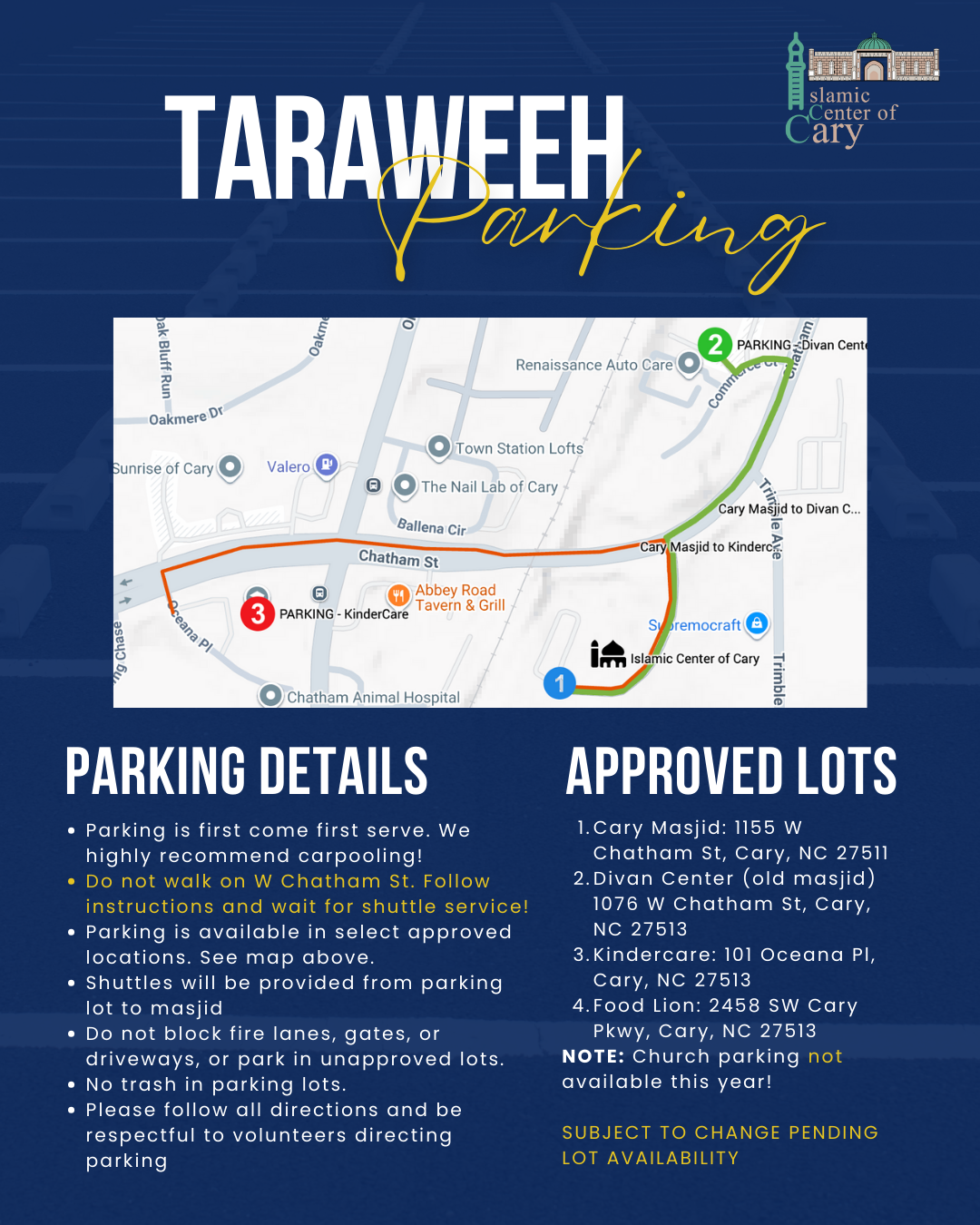 Please note that parking is on a first come first serve basis. We highly recommend carpooling! Parking Instructions: Please do not walk on W Chatham St and follow the staff's instructions to wait for the shuttle service! Arrive early to park in the masjid lot and expect offsite parking in…